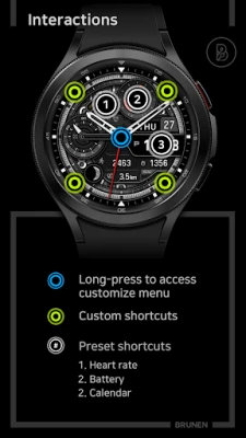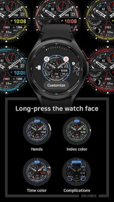 Prilagodba je srž našeg dizajna. Dajte svom satu jedinstven izgled birajući između dva stila kazaljki i deset živopisnih stilova boja za indeks. Dodatno, odaberite jednu od šesnaest boja za prikaz vremena kako biste savršeno uskladili sučelje sa svojim raspoloženjem ili odjećom. Za maksimalnu praktičnost, BRUNEN sučelje dolazi s tri unaprijed postavljene prečice za aplikacije, te četiri potpuno prilagodljive prečice, omogućujući vam brz pristup omiljenim funkcijama izravno s vašeg zapešća. Personalizacija je intuitivna: jednostavno dodirnite i držite zaslon, a zatim odaberite opciju "Prilagodi" za transformaciju vašeg sučelja.
